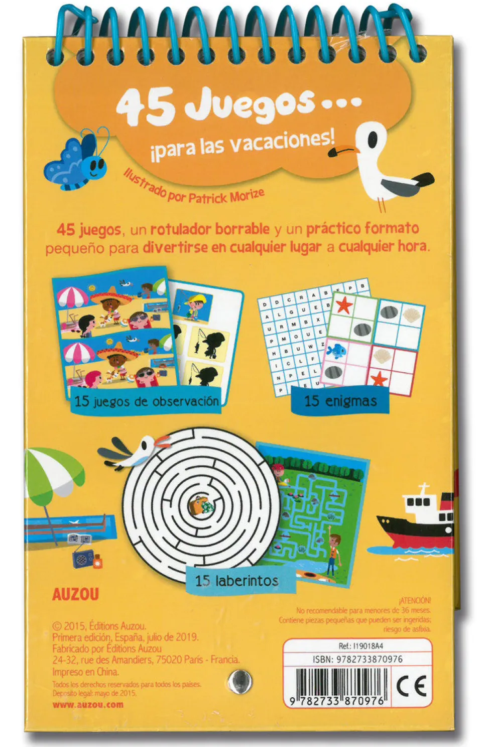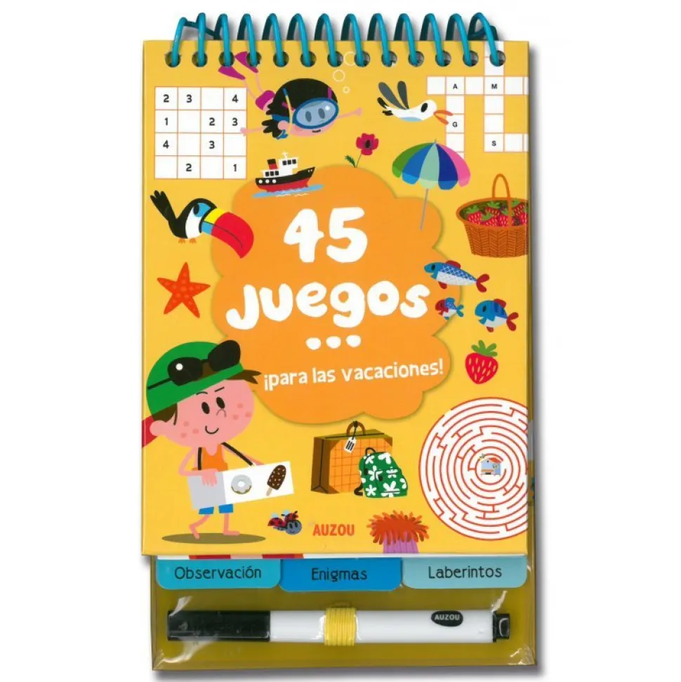 45 juegos es una colección de libro-juegos en un práctico formato pequeño con un rotulador borrable ¡para divertirse por todas partes y todo el tiempo! 45 juegos alrededor de un momento o situación, divididos en 3 secciones: 15 juegos de observación (busca y encuentra, juegos de sombras, juegos de las 7 diferencias, intruso, juego de parejas), 15 enigmas (sudoku, crucigramas, sopas de letras, juegos de deducción, unir puntos, juegos gráficos, juegos de cálculo) y 15 laberintos.