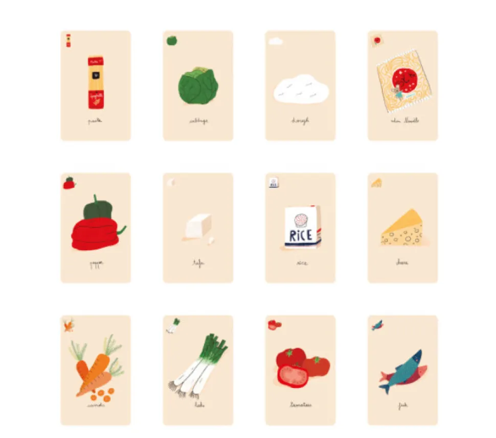 El juego incluye 17 cartas de recetas con platos de todo el mundo y 63 cartas de ingredientes.