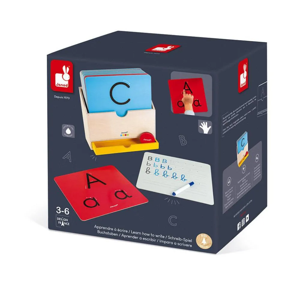 Las tarjetas se pueden guardar en la bonita y práctica cajita de madera. Incluye un pincel y un bolígrafo, que caben en el cajón. Este producto desarrolla: el aprendizaje de la escritura, el sentido del tacto.