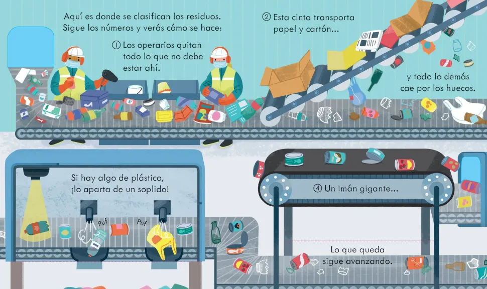 El camión de reciclaje recorre la ciudad recogiendo los residuos. Este libro con solapas es la perfecta introducción al reciclaje para los más pequeños, que al mirar por los agujeros y levantar las solapas irán entendiendo cómo funciona el proceso.