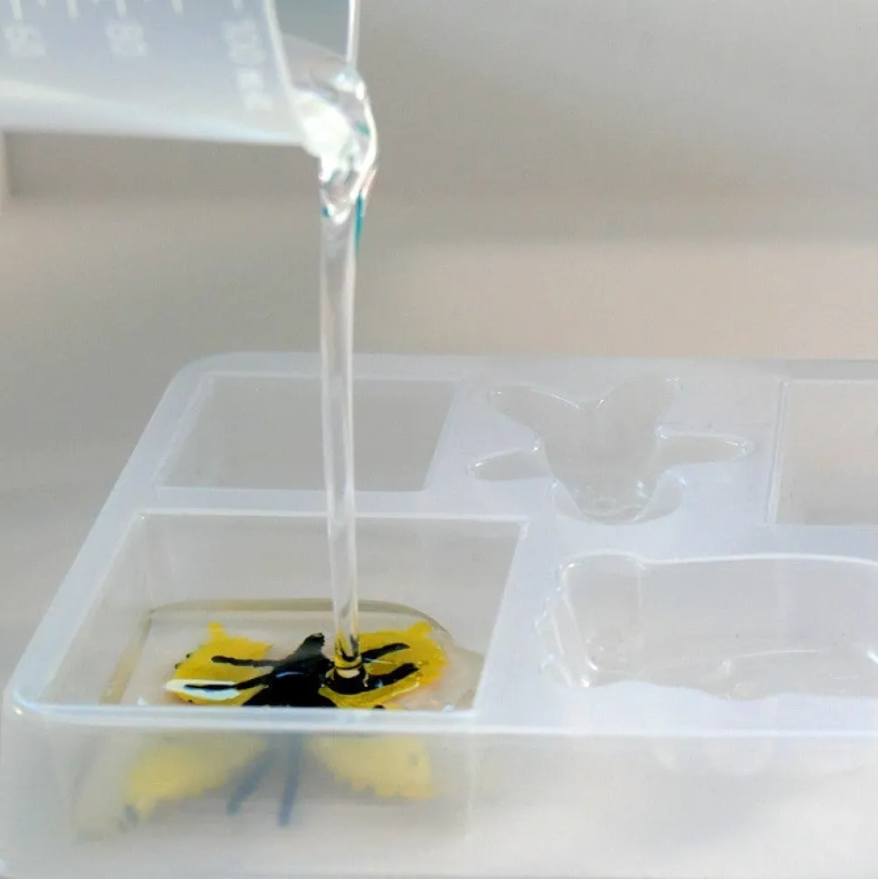 Todo lo que hay que hacer es mezclar resina con un catalizador, eventualmente colorear la preparación y luego verterla en los diferentes moldes y colgantes ofrecidos. Las lentejuelas y las mini frutas propuestas permiten realizar inclusiones para realzar estas futuras piezas de decoración. ¡20 horas más tarde, estas creaciones se pueden desmoldar fácilmente para convertirse en magníficas pulseras, anillos, collares y llaveros!
