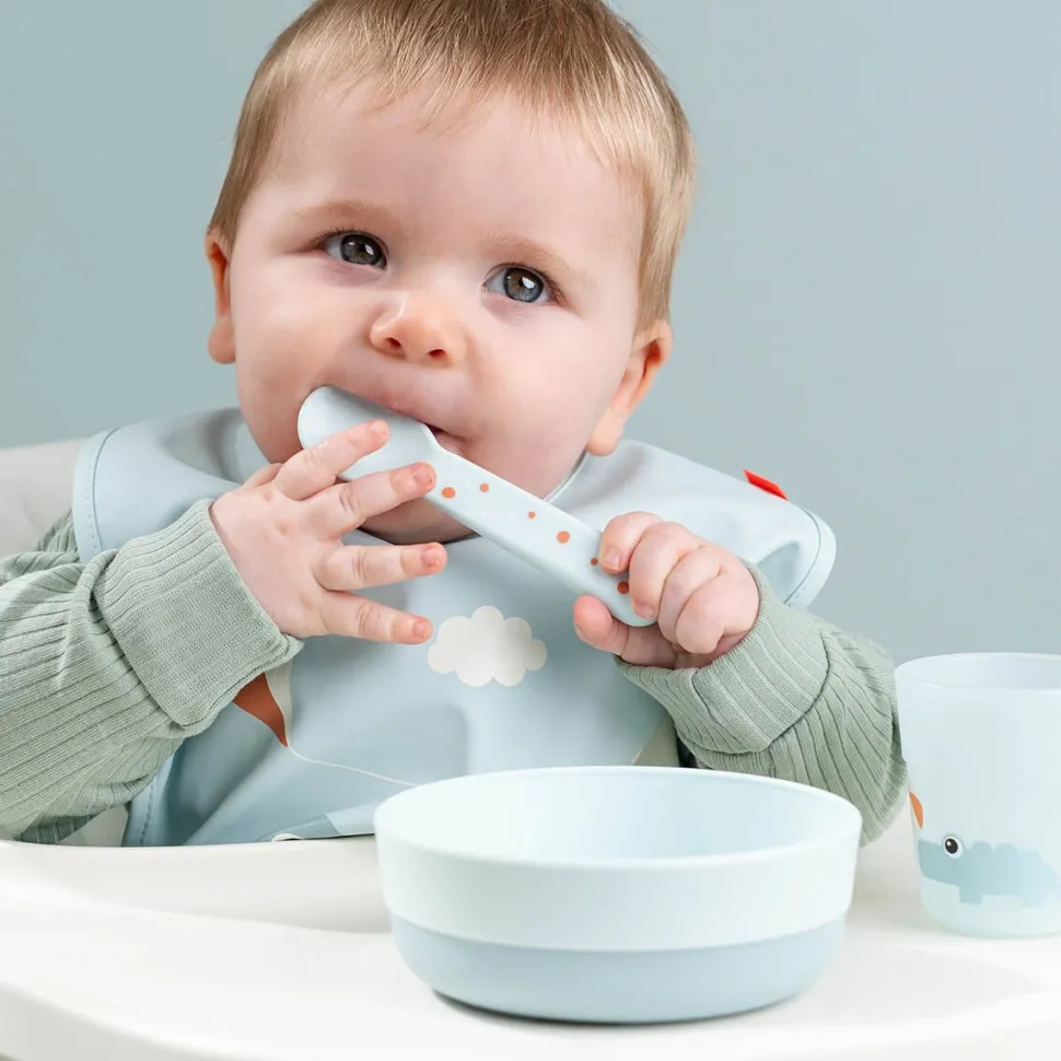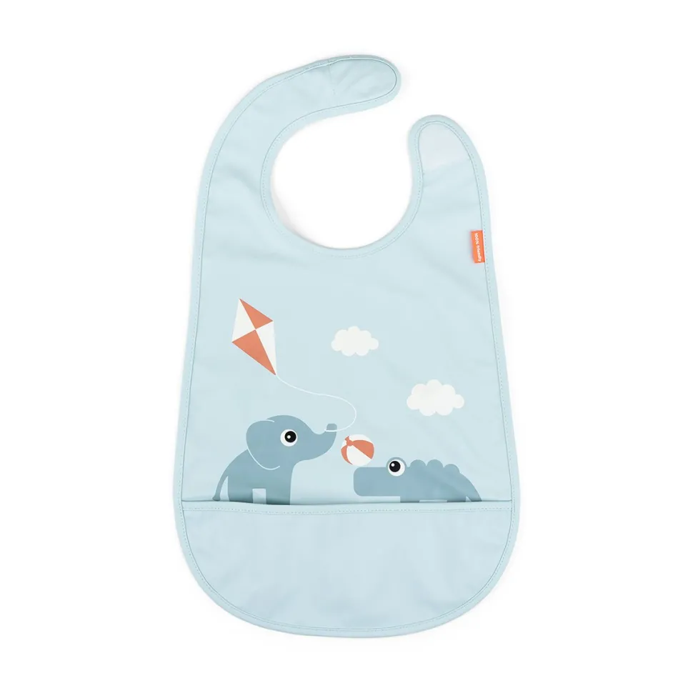 Babero con bolsillo recogemigas y velcro en el cuello para que sea mas sencillo poner y quitar. 100% polyester revestido con PU.
