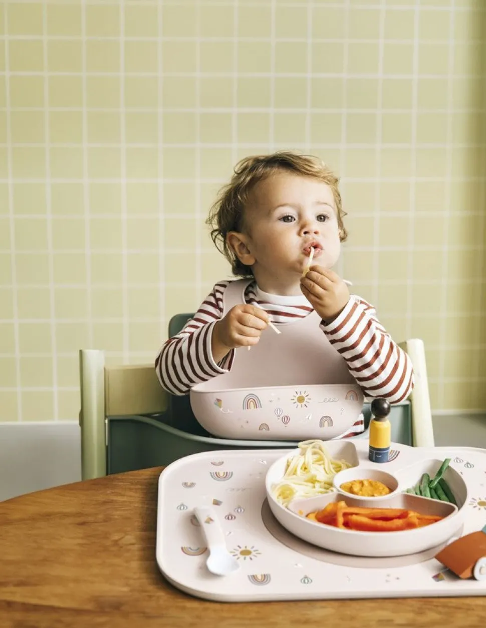 Babero de silicona de la colección MIO con cierre ajustable en el cuello y bolsillo profundo para atrapar la comida. Fácil de limpiar y transportar.