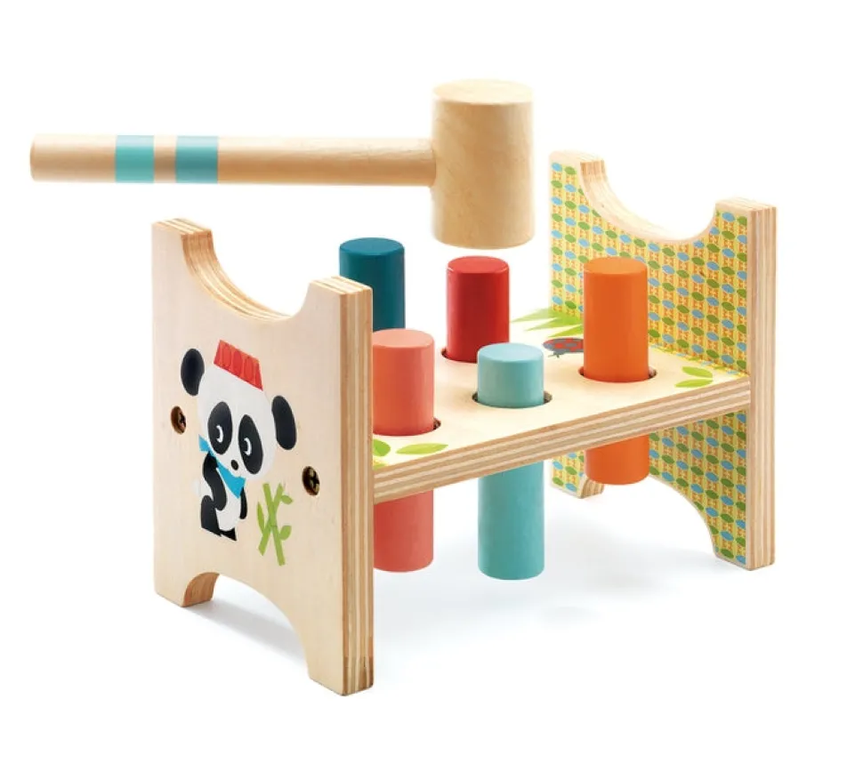 Un juego de tap-tap de madera natural de colores vivos para niños a partir de 18 meses. El niño coloca los cilindros de colores en los agujeros y, con el mazo, los golpea para introducirlos. ¡Cuando termina, le da vuelta la base y comienza de nuevo!