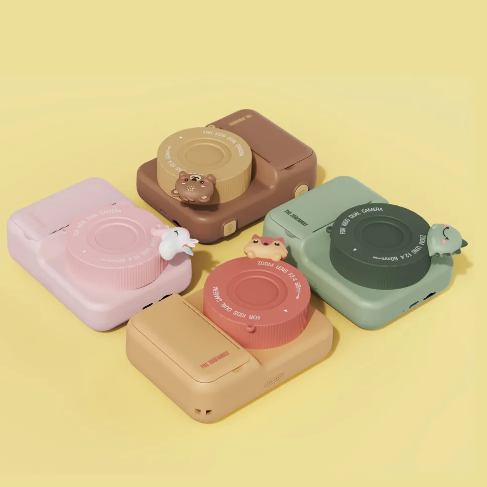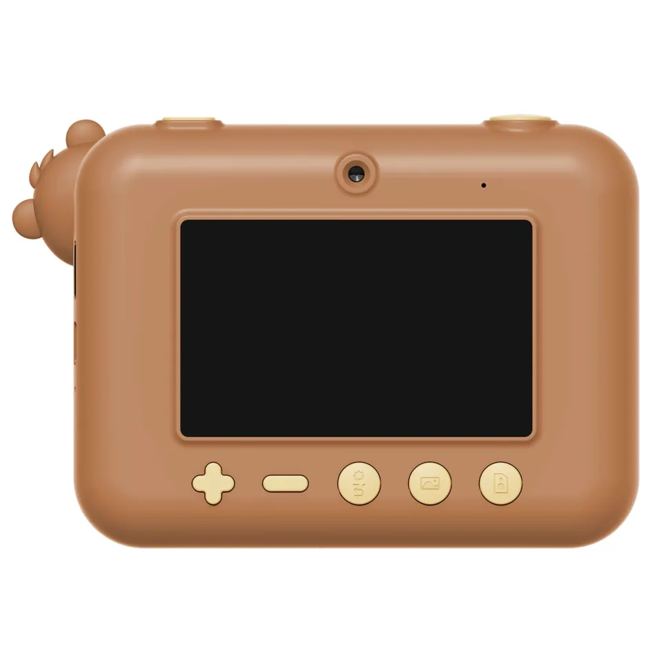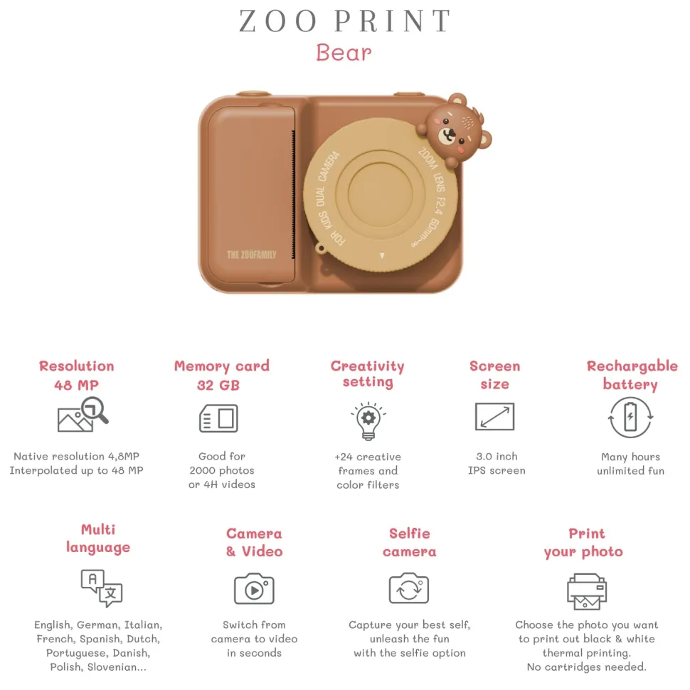 Te presentamos esta elegante cámara instantánea en forma de animalito para niños Esta adorable cámara instantánea imprime fotografías en blanco y negro directamente desde la cámara o las guarda para imprimirlas más tarde. Cuenta con una brillante pantalla a color de 3 pulgadas, protección de lente y buena resolución de impresión.