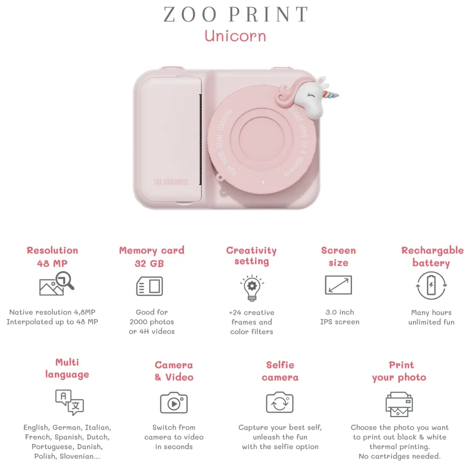 Te presentamos esta elegante cámara instantánea en forma de animalito para niños Esta adorable cámara instantánea imprime fotografías en blanco y negro directamente desde la cámara o las guarda para imprimirlas más tarde. Cuenta con una brillante pantalla a color de 3 pulgadas, protección de lente y buena resolución de impresión.