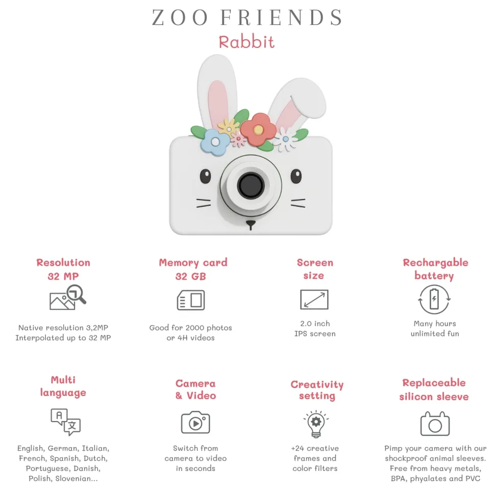 La Zoo Friends es una cámara digital con forma de animalitos ideal para los niños. Su cálida carcasa de silicona les anima a hacer fotos. La cámara está diseñada ergonómicamente para que las manos de los más pequeños puedan sujetarla y manejarla con facilidad.