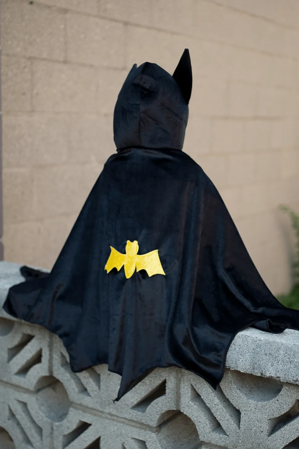 ¡Listos fans de los superhéroes! Esta capa de murciélago con capucha presenta grandes orejas de murciélago en la capucha y un impresionante emblema de murciélago en la parte posterior de la capa. La capa está hecha de tela de terciopelo suave y está cortada como las alas de un murciélago real.