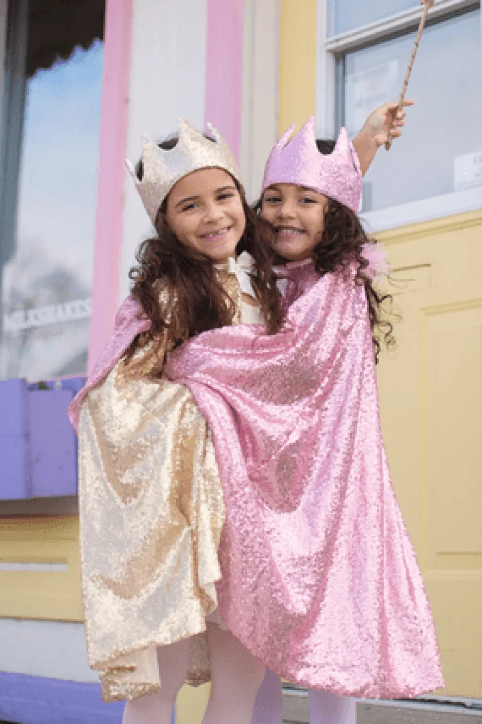 Nuestra capa está hecha con cientos de lentejuelas doradas y forrada con malla suave. La capa tiene un hermoso lazo dorado en el cierre del cuello con velcro. ¡Esta capa brillará cuando te muevas y es perfecta para los pequeños a los que les encanta jugar a disfrazarse!