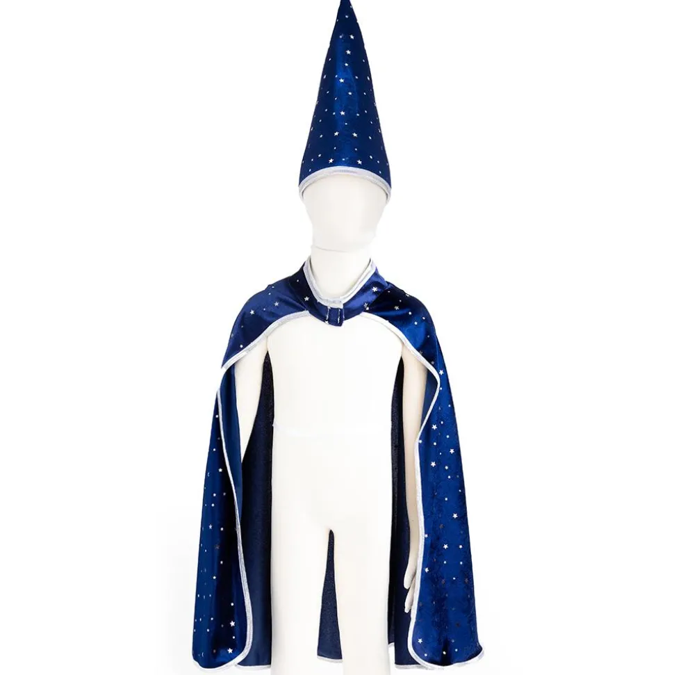 Con estrellas y lunas estampadas con purpurina plateada sobre un terciopelo azul medianoche intenso. Este conjunto de 2 piezas incluye un sombrero de mago puntiagudo con una correa elástica para la barbilla y una capa para una apariencia completa y mágica. Capa con cierre de velcro para ponérsela y quitársela fácilmente.