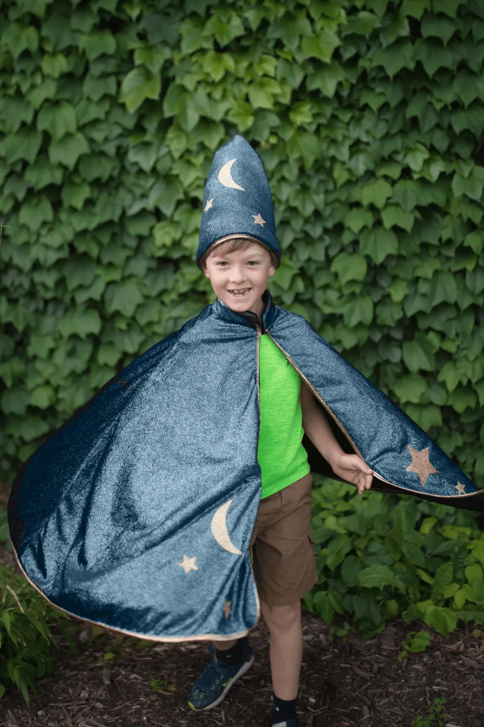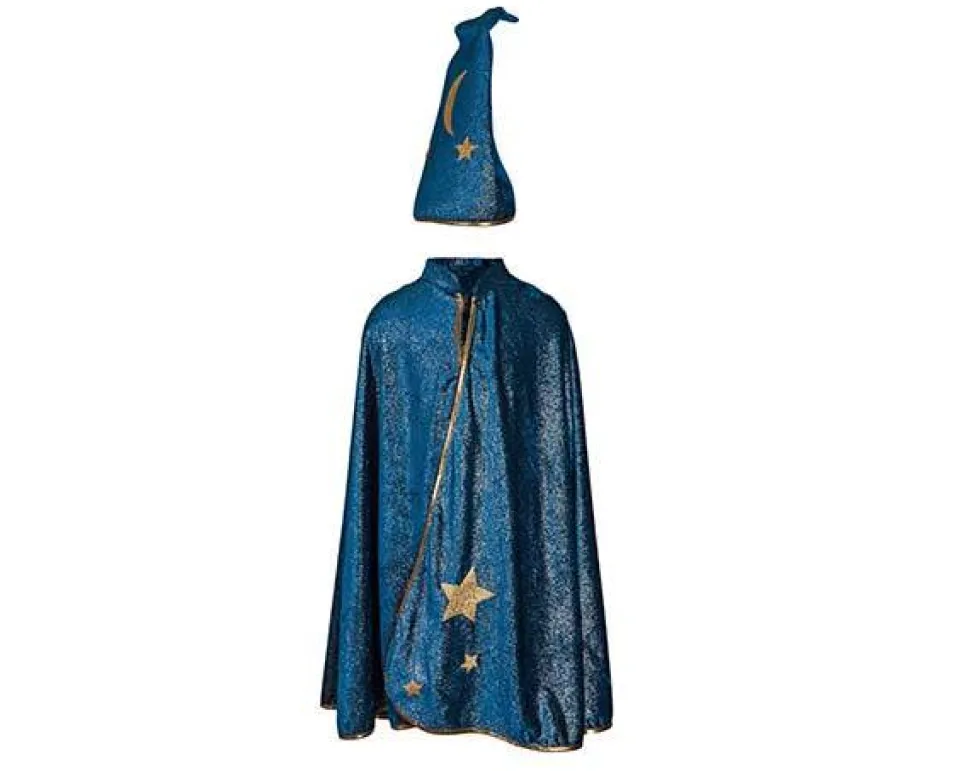 ¡Esta capa y sombrero de mago de primera calidad seguramente te hechice! Suave y cómoda, diseñada para parecerse al misterioso cielo de medianoche con dibujos de estrellas y lunas, ¡esta es la capa perfecta para fomentar el juego creativo todos los días!