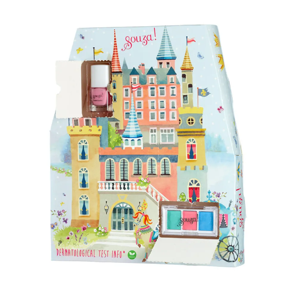 ¡Sorpresa! Este estuche con forma de castillo tiene 8 puertas con distintos productos de maquillaje: 2 esmaltes de uñas, 3 sombras de ojos, 2 brillos de labios, colorete y dos aplicadores.