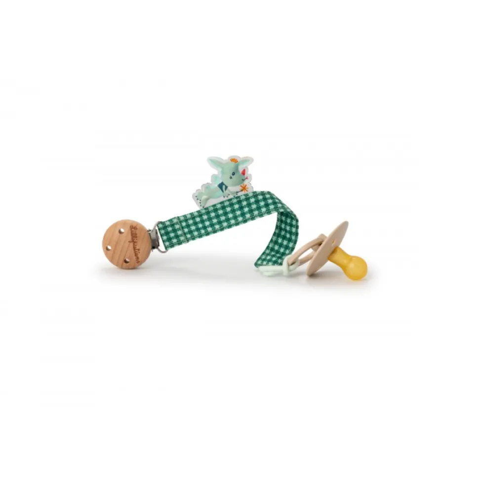 Este alegre sujetador de chupete mantiene el chupete al alcance de tu pequeño. Hecho de algodón orgánico y madera certificada por FSC