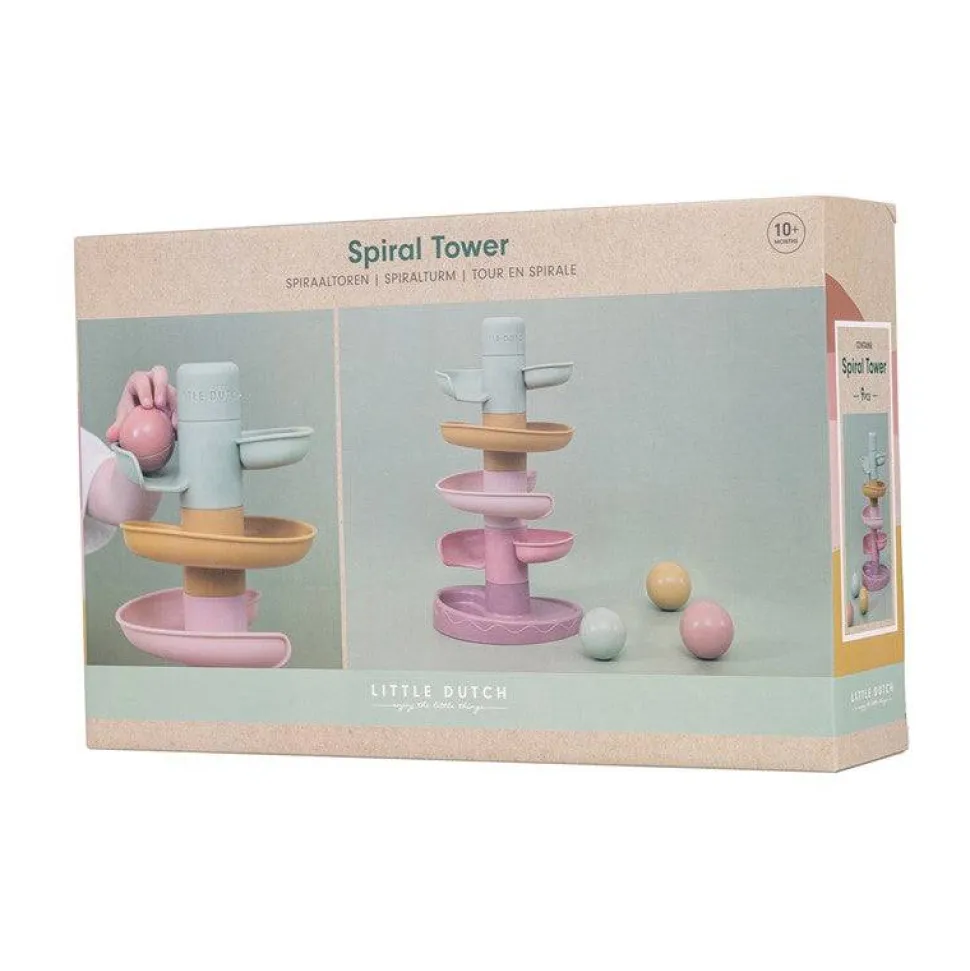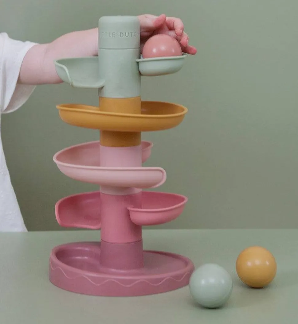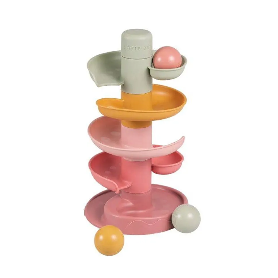 El colorido juguete consta de 5 piezas de tonos suaves que su pequeño puede apilar fácilmente. Deje caer las bolas una por una en el nivel superior y vea cómo cada una de ellas se enrolla y rueda hacia abajo.