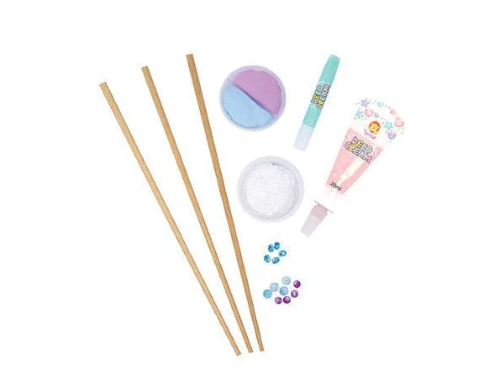 Cada juego incluye 3 varitas de madera, un bote dúo de Super Clay (2 colores), 1 tubo de 30 ml de Deco Cream rosa, 1 tubo de 6 ml de Deco Cream aqua, 1 bote de espuma modeladora blanca, 13 perlas y piedras preciosas y libro con instrucciones