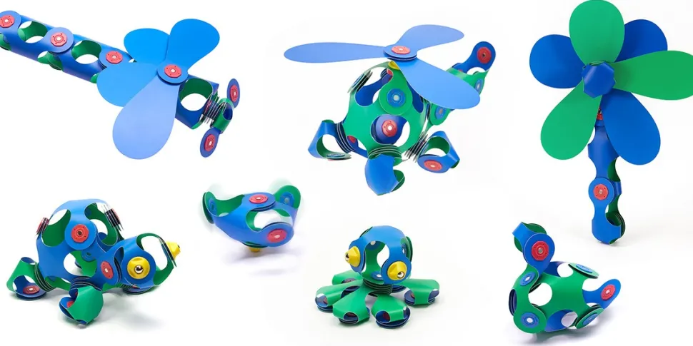 30 piezas en 8 formas únicas de CLIXO y una guía de inicio rápido. Con este pack se pueden construir hélices o molinos porque contiene 3 piezas en forma de spinner para que las piezas puedan girar sobre si mismas.