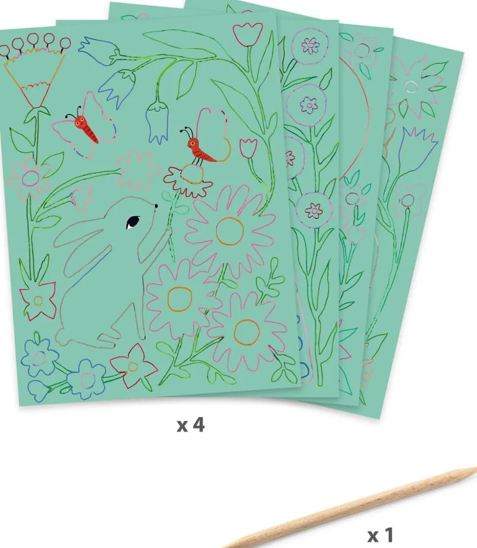 Un estuche de 4 tarjetas para rascar con adorables ilustraciones: los animales del jardín se encuentran en una decoración floral. El niño reproduce los dibujos imaginados por el artista raspando la superficie con el punzón