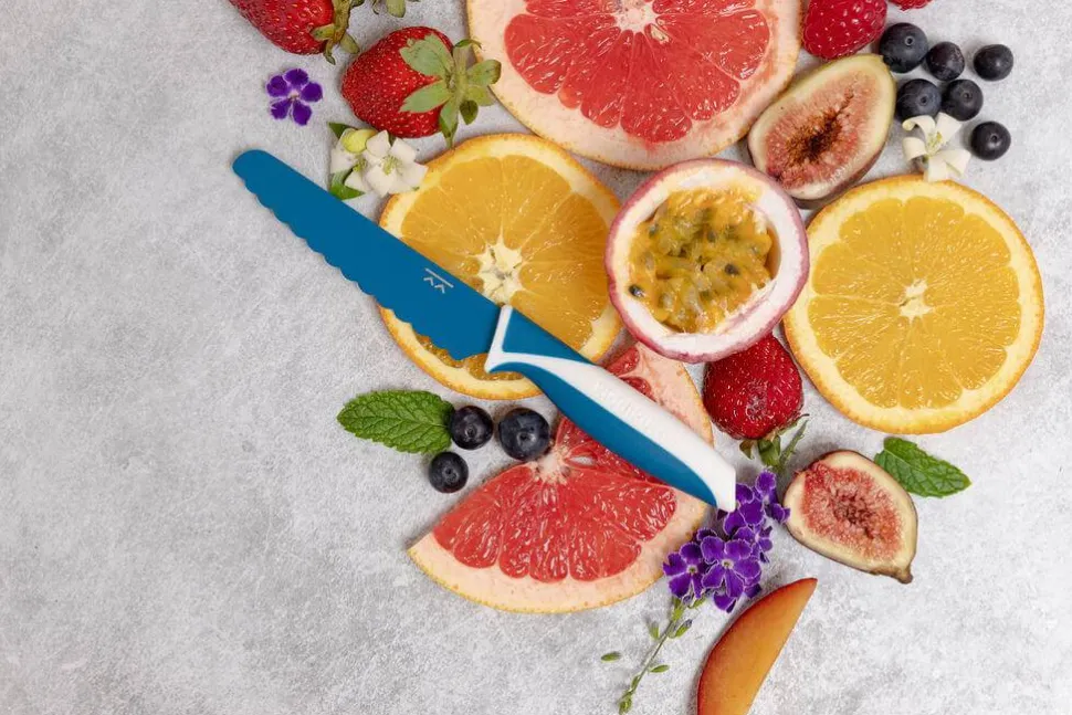 Estos cuchillos están diseñados para niños a partir de los 3 años, para que puedan cortar su comida de forma segura. Cortarán cualquier cosa que un cuchillo afilado pueda cortar, pero no les cortará sus deditos debido a las sierras redondeadas de acero inoxidable. Funcionan con la acción de serrado, pero no corta porque no están afilados.