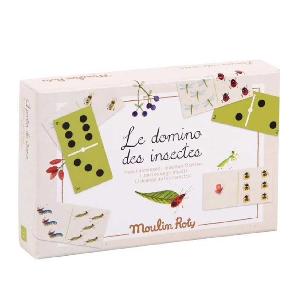El clásico juego del dominó con fichas grandes ilustradas con los insectos que habitan el jardín.