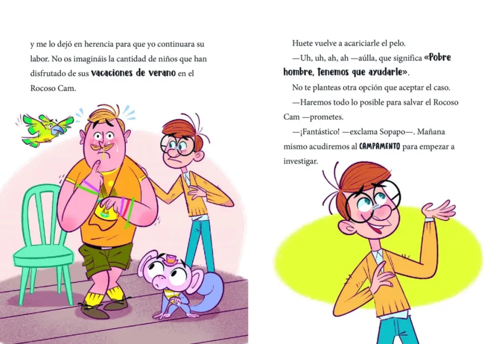 Tu vecino, el Detective Sopapo, tiene un gran corazón… pero ¡es un desastre como detective! Con su fiel (y travieso) mono Huete, necesita tu ayuda para salvar un campamento de verano en el que suceden cosas muy extrañas… En cada página, tú decides qué hacer. ¿Seguirás una pista en el bosque? ¿Interrogarás a los campistas? ¿Montarás guardia o te arriesgarás en una misión nocturna?