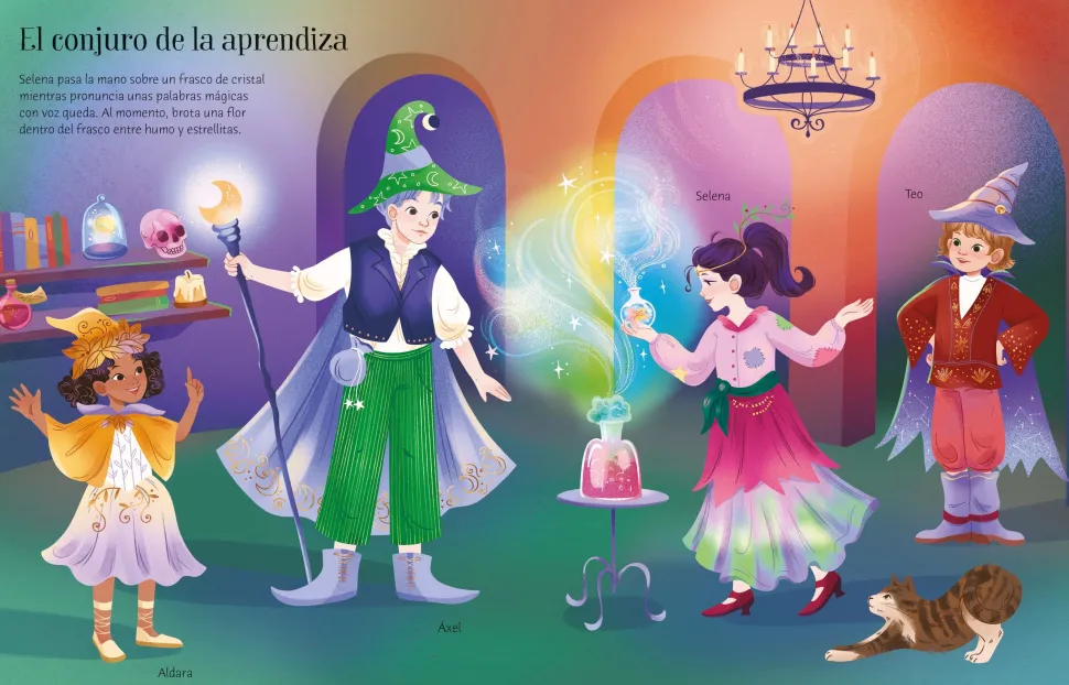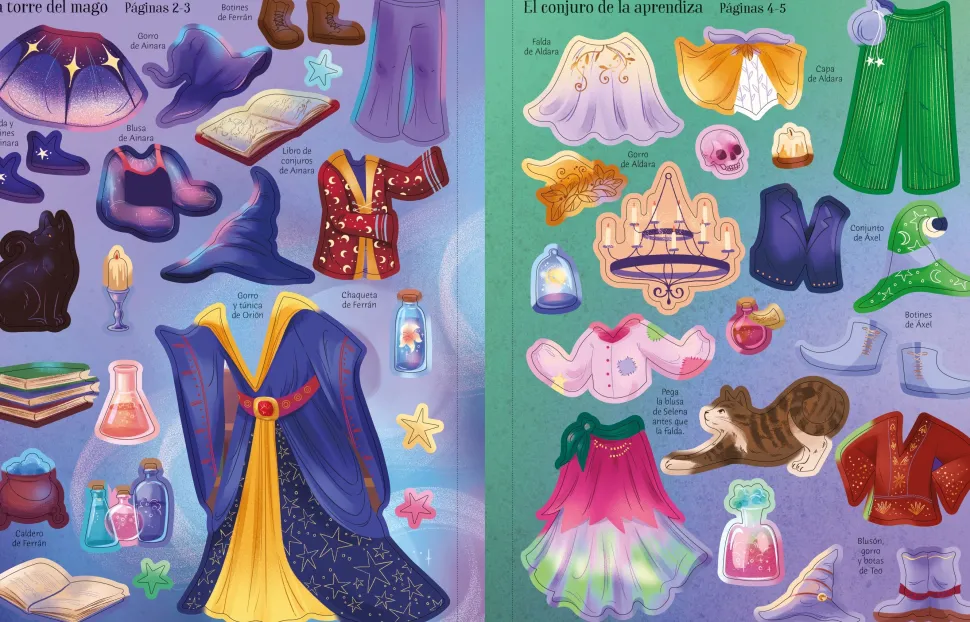 Con la ayuda de las pegatinas, los niños podrán vestir a las brujas y magos de este libro hechizado. Entre las escenas se incluyen de pociones mágicas, una cueva con luz de velas y un bosque encantado. Además de la ropa para vestir a los personajes, también hay un montón de pegatinas para decorar las escenas, como por ejemplo murciélagos, gatos y búhos.