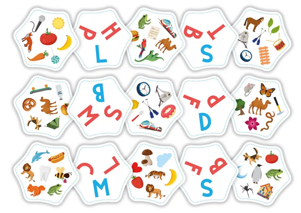 Se forma una pila en el centro de la mesa, con todas las cartas con las letras hacia arriba. El primero/a en encontrar un enlace, es decir, en asociar una letra con un objeto, colocar la mano encima de la carta y decir la palabra correctamente, se lleva la carta.