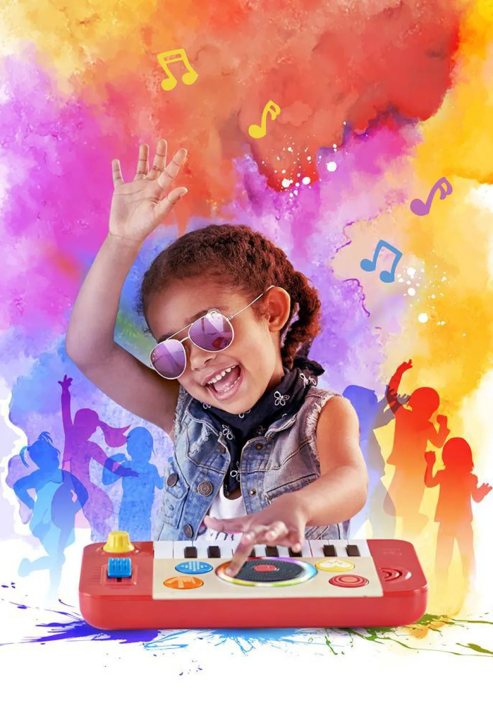 ¡Los pequeños aspirantes a DJ podrán pinchar sus primeras canciones con este estudio portátil! Con él, podrán tocar el teclado con uno de los cuatro sonidos instrumentales o 18 graciosos efectos de sonido, o también podrán iniciar una de las 5 tonadas de fondo y utilizar el deslizador de tempo para cambiar la velocidad, añadir efectos de sonido DJ ¡y pinchar el vinilo!