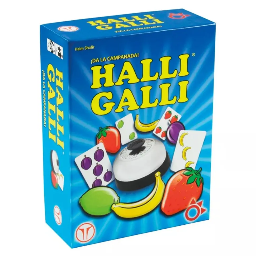 En Halli Galli tienes que estar super atento y contar las frutas que van apareciendo en las cartas para ser el primero en reaccionar y pulsar el timbre justo cuando haya 5 frutas idénticas.