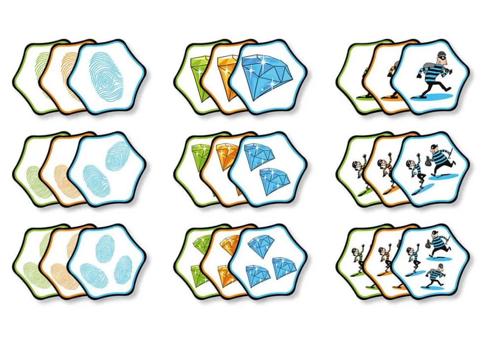 El primero/a en encontrar una combinación correcta de diamantes, ladrones y huellas, y coger el diamante, se quedará con esas cartas. Y así, quien consiga más cartas al final, será el ganador.