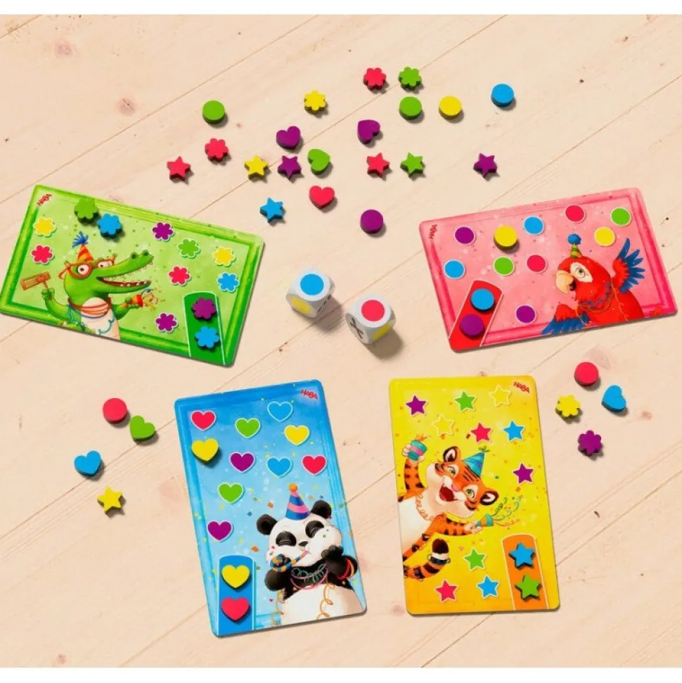 ¿Qué hace falta para organizar una fiesta estupenda? Por supuesto, un montón de confeti de colores, eso siempre crea un ambiente festivo. Panda, Cocodrilo y el resto de la pandilla se lo pasan genial con sus cañones de confeti. Ganará quien, con un poco de suerte con los dados, logre repartir primero el confeti de colores por todo su animal.