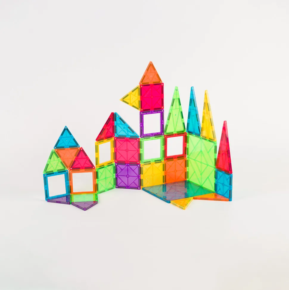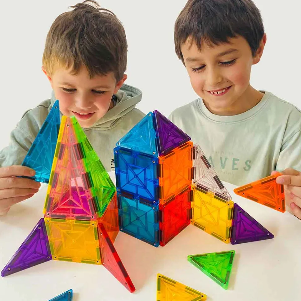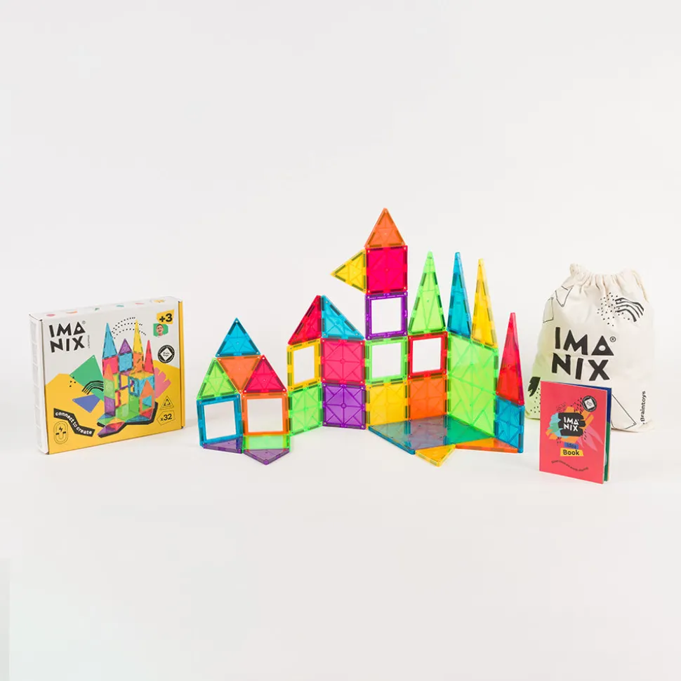 Imanix está compuesto de piezas geométricas de diferentes tamaños, formas y colores realizadas en plásticos no tóxicos traslúcidos cuyos perfiles contienen los imanes en su interior. Esta disposición de los imanes asegura que no exista ningún riesgo de que niños o niñas puedan tragarse por error un imán, ya que están incrustados en el interior de cada pieza y no son piezas sueltas. Además, estos Imanix 32 se presentan en una caja de dimensiones asequibles y repleta de diversión. Imanix 32 piezas contiene un surtido interesante de piezas para aproximarse a esta marca y empezar a imaginar y construir.