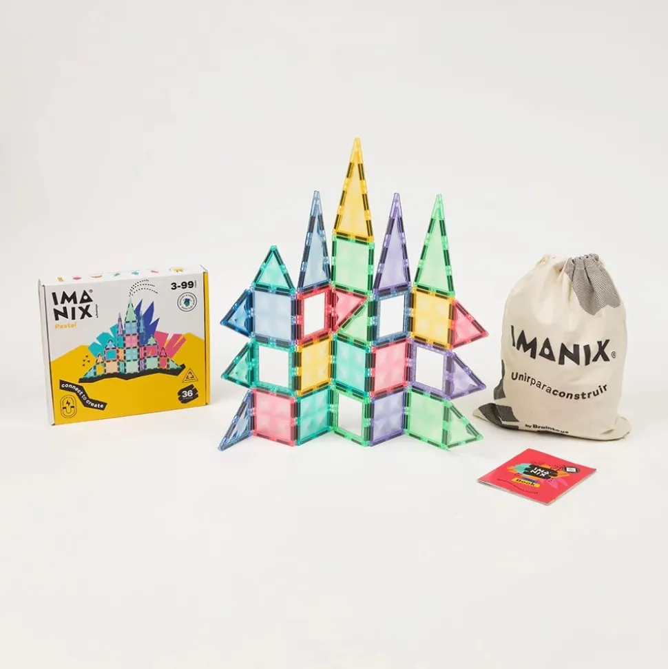 Imanix está compuesto de piezas geométricas de diferentes tamaños, formas y colores realizadas en plásticos no tóxicos traslúcidos cuyos perfiles contienen los imanes en su interior. Esta disposición de los imanes asegura que no exista ningún riesgo de que niños o niñas puedan tragarse por error un imán, ya que están incrustados en el interior de cada pieza y no son piezas sueltas. Además, estos Imanix 32 se presentan en una caja de dimensiones asequibles y repleta de diversión. Imanix 32 piezas contiene un surtido interesante de piezas para aproximarse a esta marca y empezar a imaginar y construir.