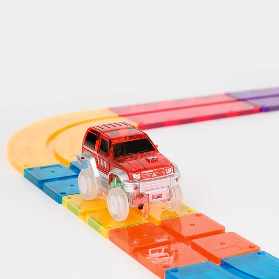Piezas de bifurcaciones, bumps y distintas curvas se suman a los ya existentes desniveles, puentes y señales de tráfico. Incluye 2 autos que corren por el circuito.