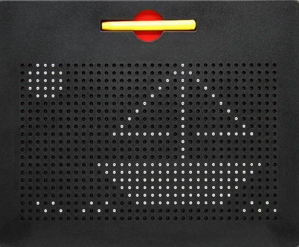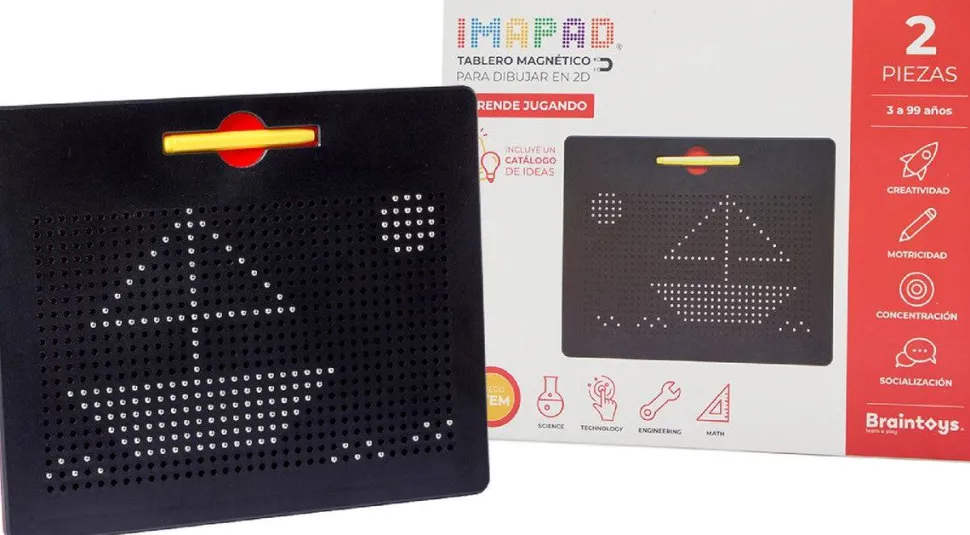 Tablero compuesto por pequeñas pelotitas imantadas que suben a la superficie gracias al poder del lápiz magnético que permite formar figuras y diseños en 2D.