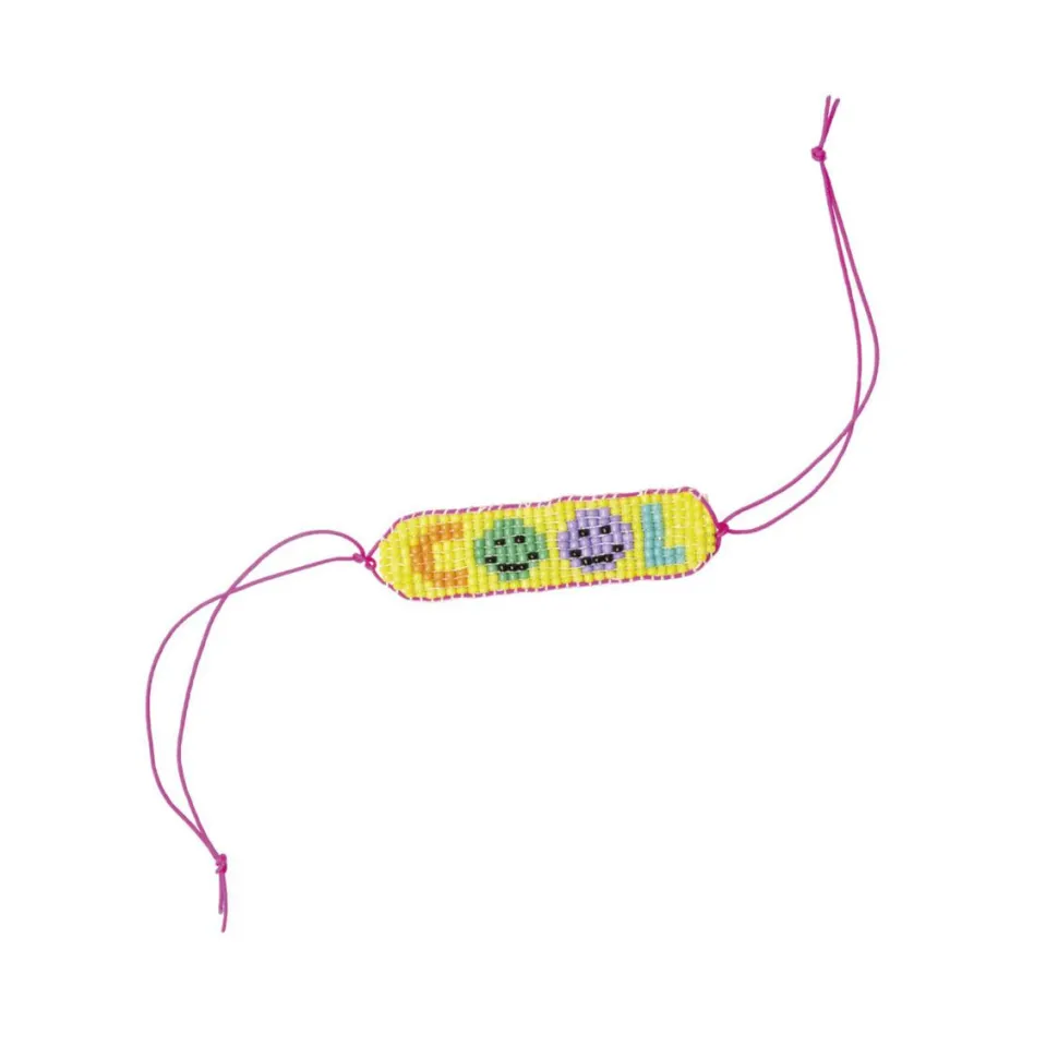 Este kit creativo contiene un telar para tejer de madera que permite crear 13 joyas pop de cuentas de rocalla. El estuche está compuesto por 10 tubos de 500 cuentas de rocalla de diferentes colores, hilo de algodón blanco, un telar para tejer, 2 agujas y 2 hilos de jade de color. La variedad de cuentas y de los diversos modelos presentes en el folleto de instrucciones permite crear preciosas pulseras de la amistad, para regalar o guardar. La confección de una joya requiere aproximadamente 2 horas. Esta actividad desarrolla la creatividad y la destreza.