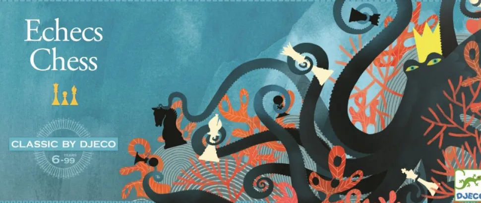 Djeco reversiona el imprescindible ajedrez con un tablero adornado con el fondo submarino. ¡Hay que sumergirse en las profundidades de la estrategia para intentar ganar la partida!