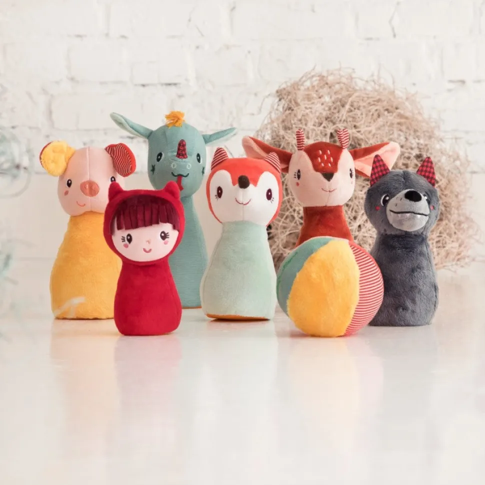 Un juego de bolos estimulante que les encanta a los más pequeños. Los bolos, suaves y de vivos colores, son personajes del cuento de Caperucita. Además, la bola tiene un sonajero oculto en el interior para una mayor estimulación sensorial.