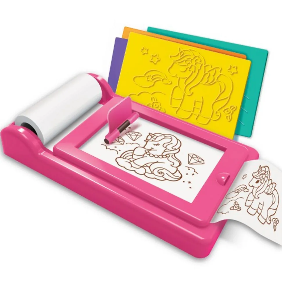 Es un entretenido estudio de arte donde podrás hacer diferentes dibujos de dinosaurios con las plantillas que se incluyen, sólo debes poner la plantilla y colocar el papel encima, usa el rodillo y comenzará aparecer tu dibujo, podrás cortarlo y seguir dibujando