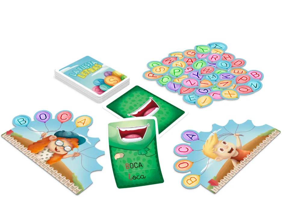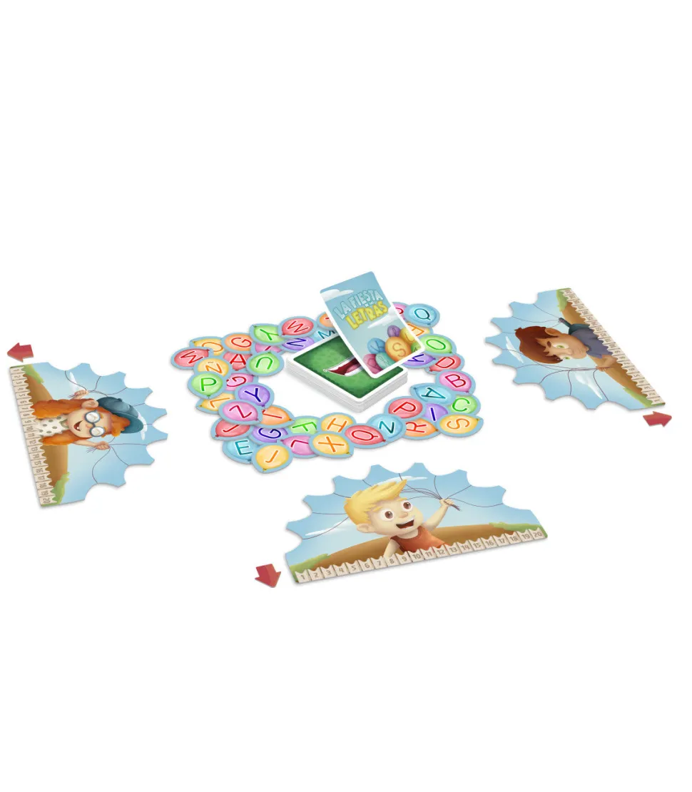 - CONTENIDO: 4 tableros de jugador. 4 marcadores de puntos. 88 globos con letras. 96 cartas con 3 niveles de dificultad. 1 carta de Fiesta de las letras. 1 libro de instrucciones y guía con 10 modos de juego.