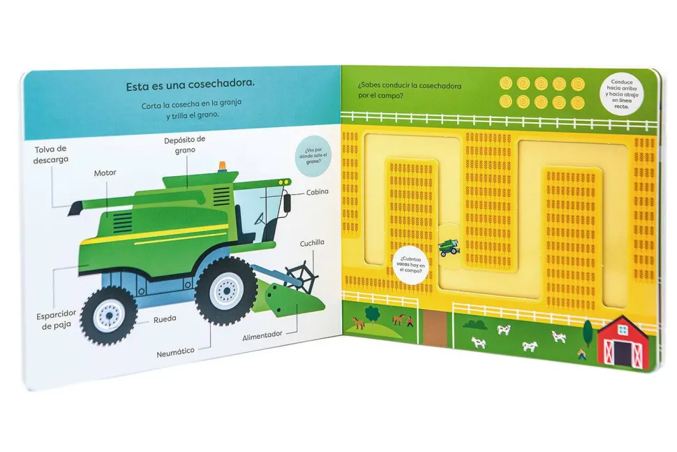 Un libro todo cartón que nos presenta cuatro vehículos de la granja con el vocabulario de las distintas partes de esos vehículos y un circuito en cada doble página para recorrer los escenarios de la granja con una ficha de cartón. ¡El regalo perfecto para las niñas y los niños a los que les gusta conducir y para entusiastas de los tractores! ¿Sabes conducir el tractor por la granja? Abre caminos con el dedo y con las fichas de este libro.