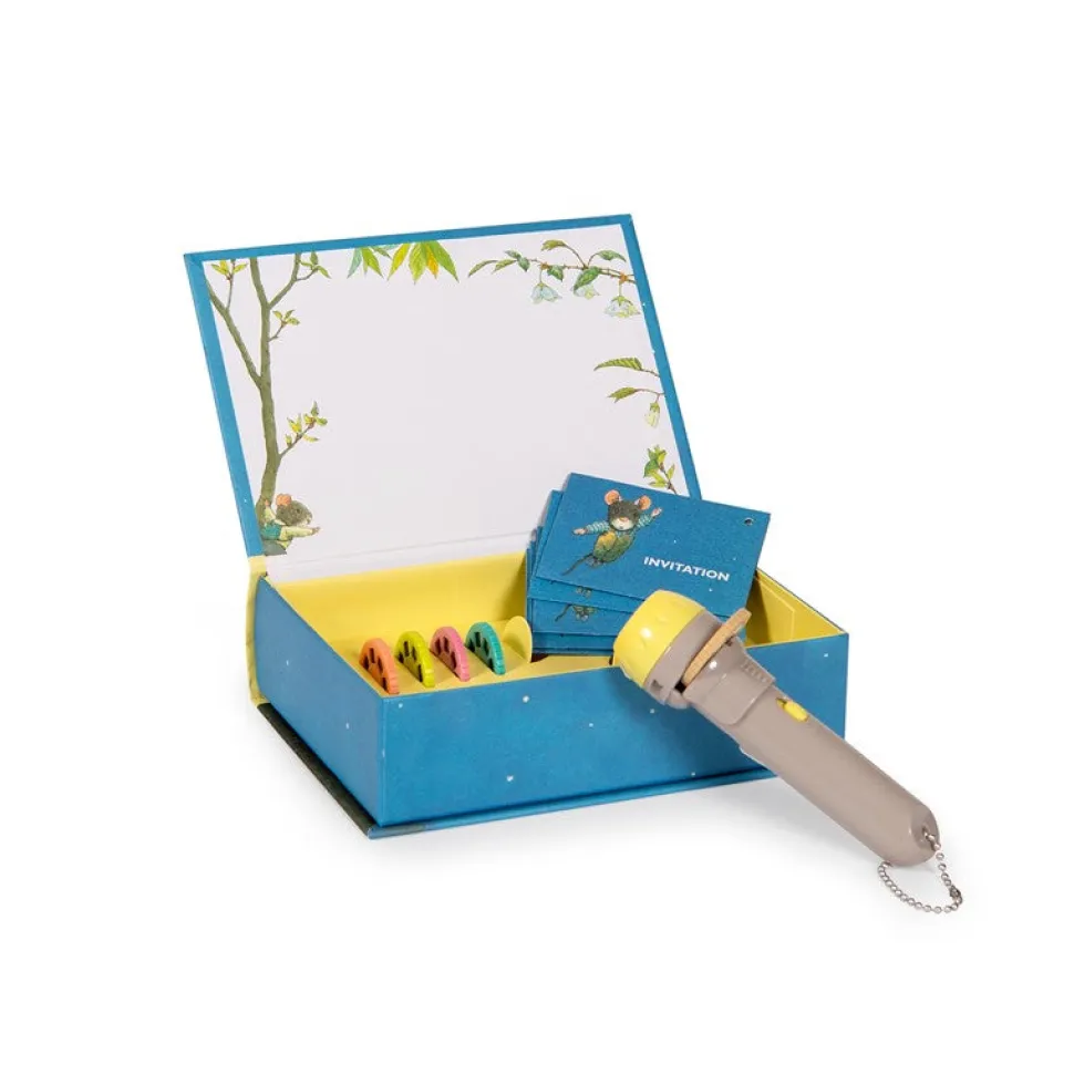 Caja magnética con forma de libro. La tapa se puede usar para proyectar la imagen. Incluye linterna y 5 discos de cuentos