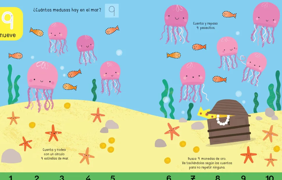 Un libro pizarra perfecto para ayudar a los niños a aprender a contar. Con múltiples actividades en cada página para dibujar, reseguir números o empezar a hacer los primeros cálculos sencillos.