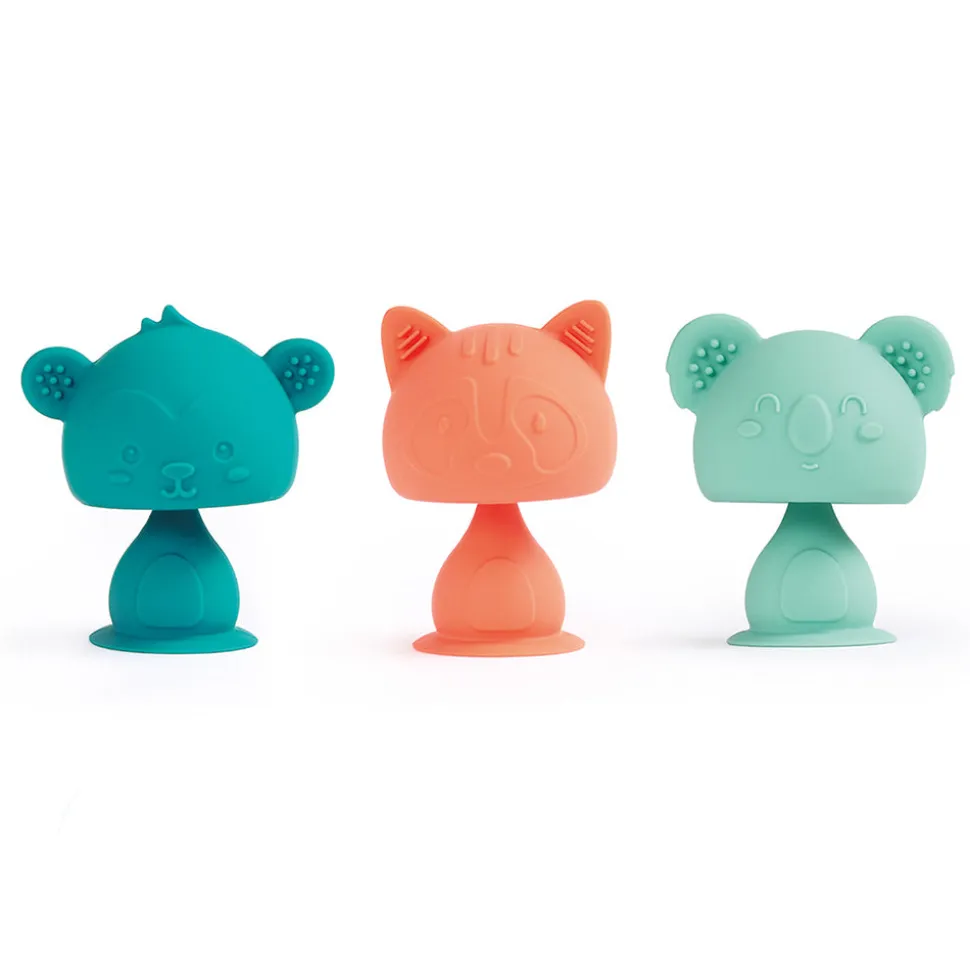 ¡El koala, el mono y el mapache están listos para animar las comidas y los juegos del bebé! Gracias a sus ventosas, estas simpáticas criaturitas se adhieren en un instante a cualquier superficie lisa: mesa, trona, bañera o incluso azulejos.