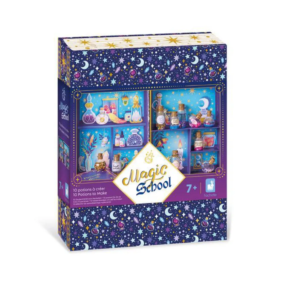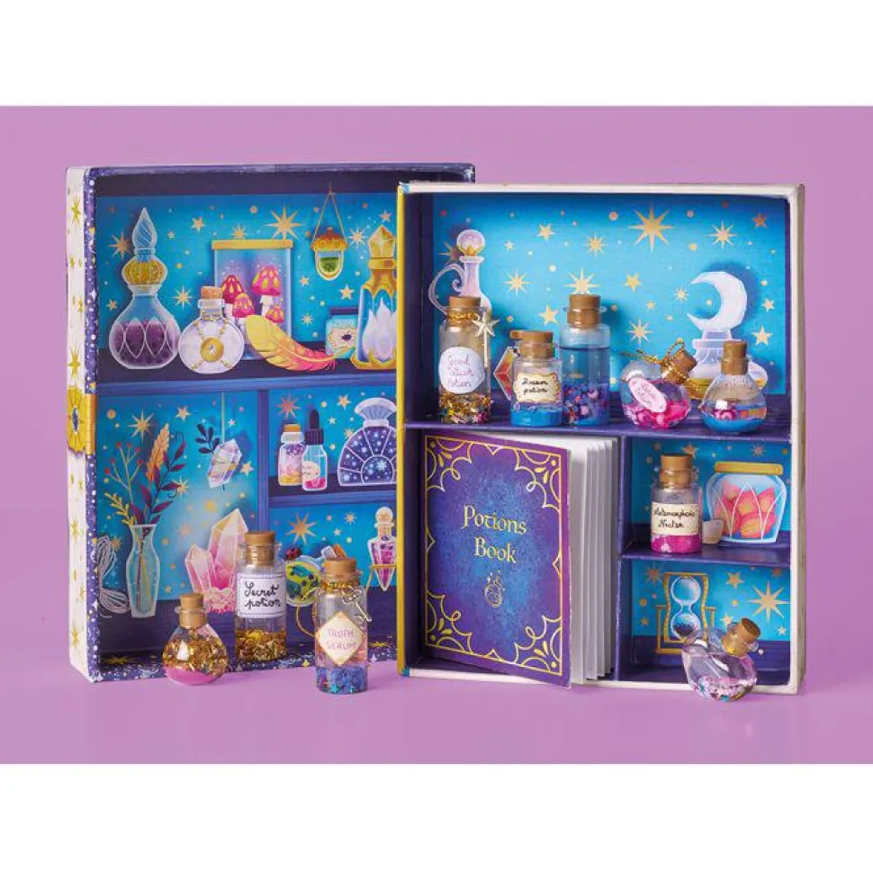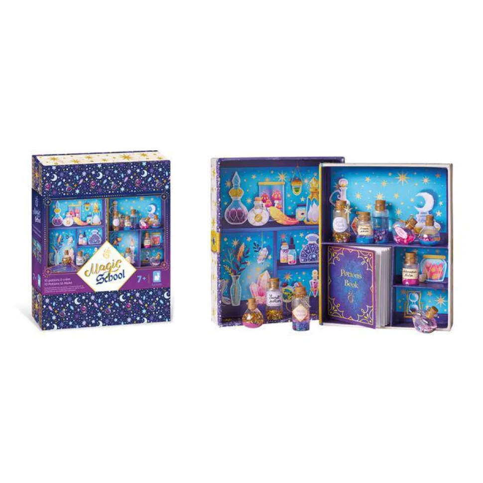 ¡Una pizca de estrellas, unas pocas lentejuelas y un toque de cuentas! ¡Esta caja creativa te permite hacer tus propias pociones mágicas en pequeños frascos usando una multitud de ingredientes y un libro de hechizos de recetas mágicas! Contiene 10 frascos de plástico con tapón, 2 tubos de arena, 20 cuentas acrílicas, 1 colgante de varita mágica, 1 varita de llave, 1 hilo dorado, 1 embudo, 2 bolsas de minibrillantes, 1 bolsa de palitos (3 modelos), 1 bolsa de estrellas, 1 bolsa de confeti metalizado, 1 lámina de pegatinas y 1 pequeño libro de hechizos con recetas. Esta actividad te permite desarrollar tu paciencia y creatividad y requiere aproximadamente 5 minutos por poción.