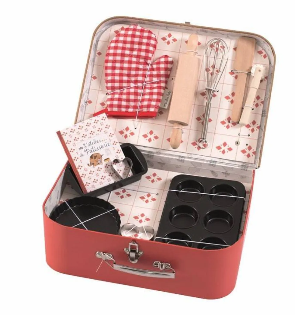 Esta pequeña maleta de estilo retro tiene todo lo que necesita para hacer las cosas grandes: un libro de recetas, agarraderas, utensilios, cortadores de galletas en forma de corazón y 3 moldes para hornear antiadherentes que se pueden hornear. Gracias a los diferentes elementos que contiene, y a su tamaño adaptado a los pequeños, dará sus primeros pasos fácilmente en la cocina. ¡Esta maleta es perfecta para futuros pasteleros!