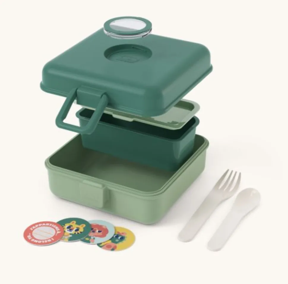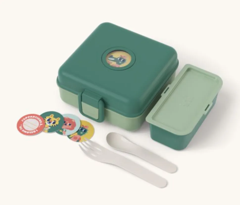 La fiambrera para niños Snacky también incluye una cajita para organizar la comida y cubiertos para guardar debajo de la tapa. Esta fiambrera para bocadillos muestran a los niños que es fácil disfrutar de una buena comida o merienda casera.