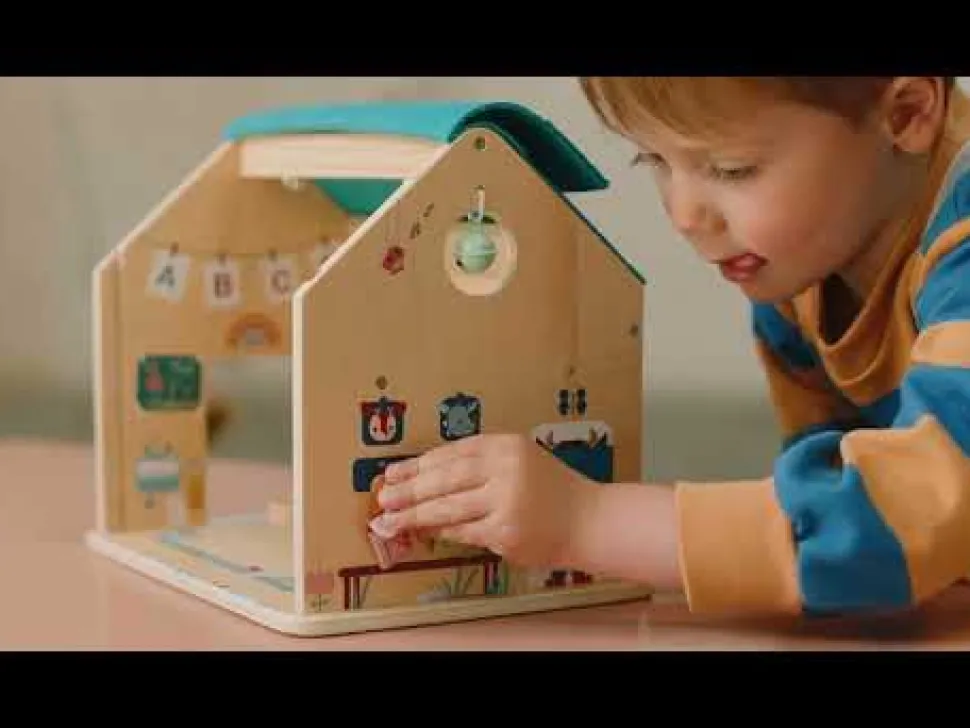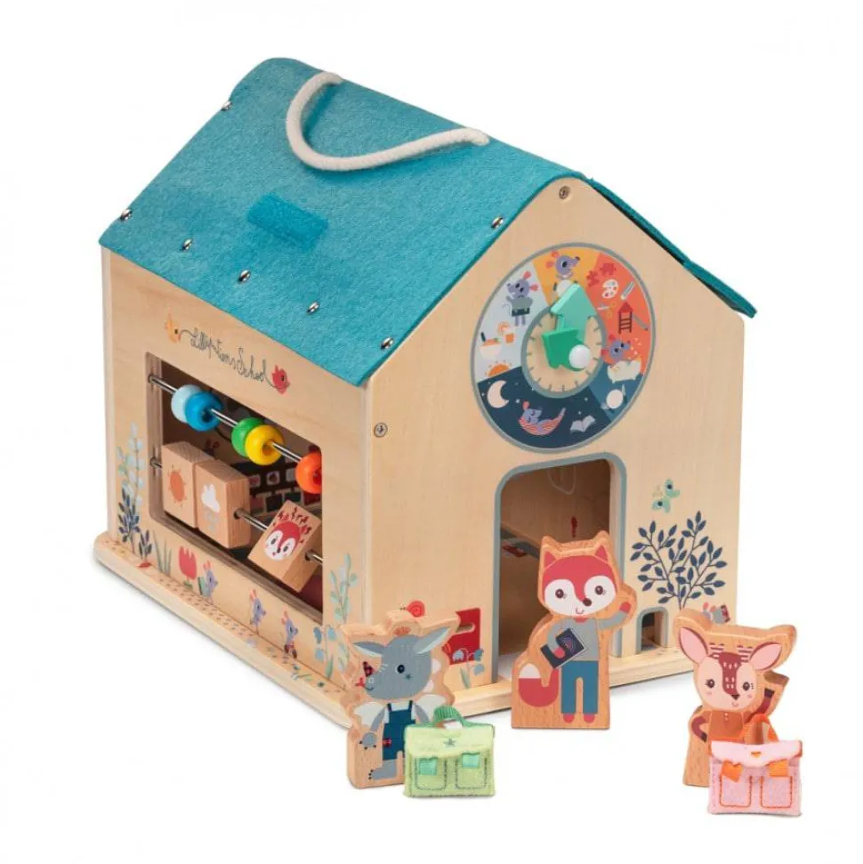 Stella y Joe van al colegio con su mochila de fieltro a cuestas. La señorita Alice, la maestra, está preparando su aula para pasar un agradable día de clase junto con sus alumnos. Esta hermosa escuela de madera incluye todos los elementos para recrear un día de escuela. Estimula tanto la motricidad fina como la imaginación.ales.