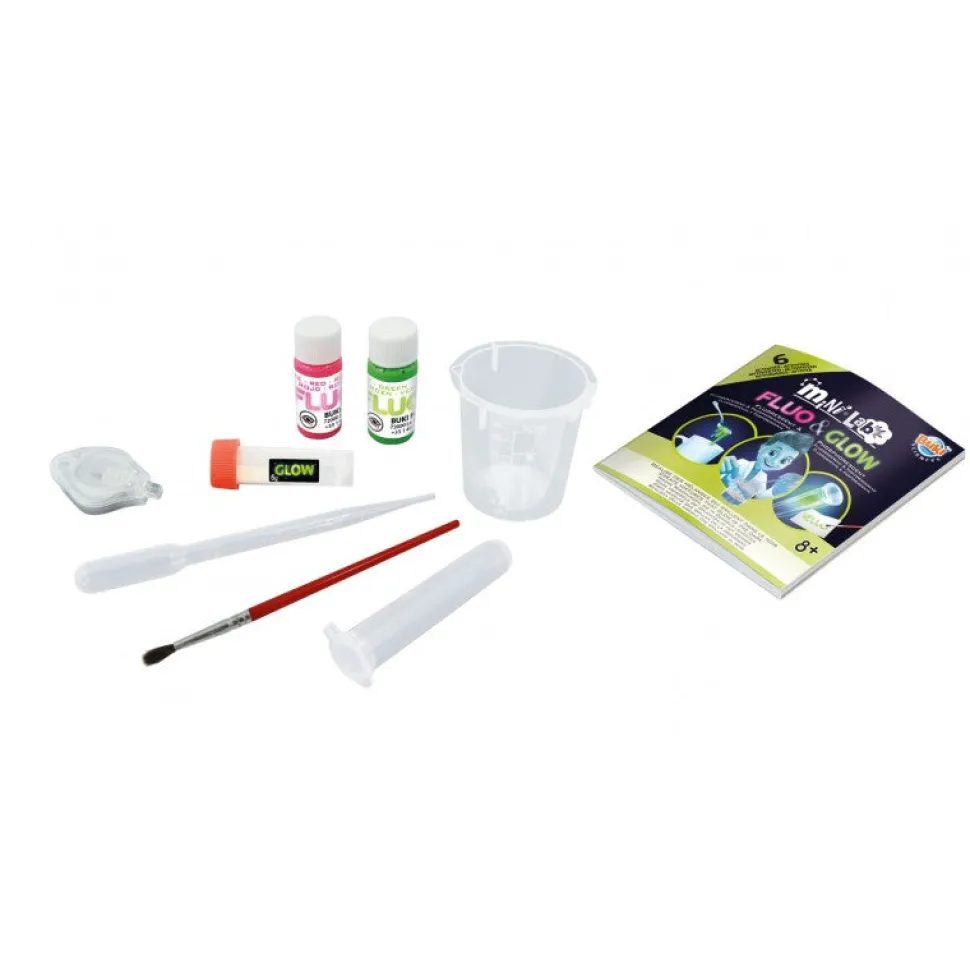 Este increíble set te ofrece nada menos que ¡15 desafíos! Slime fluorescente y fosforescente, pelotas saltarinas, lámpara de lava, experimentos con pintura luminiscente o con calor y frío, tinta invisible, estrellas fosforescentes, cristalización.