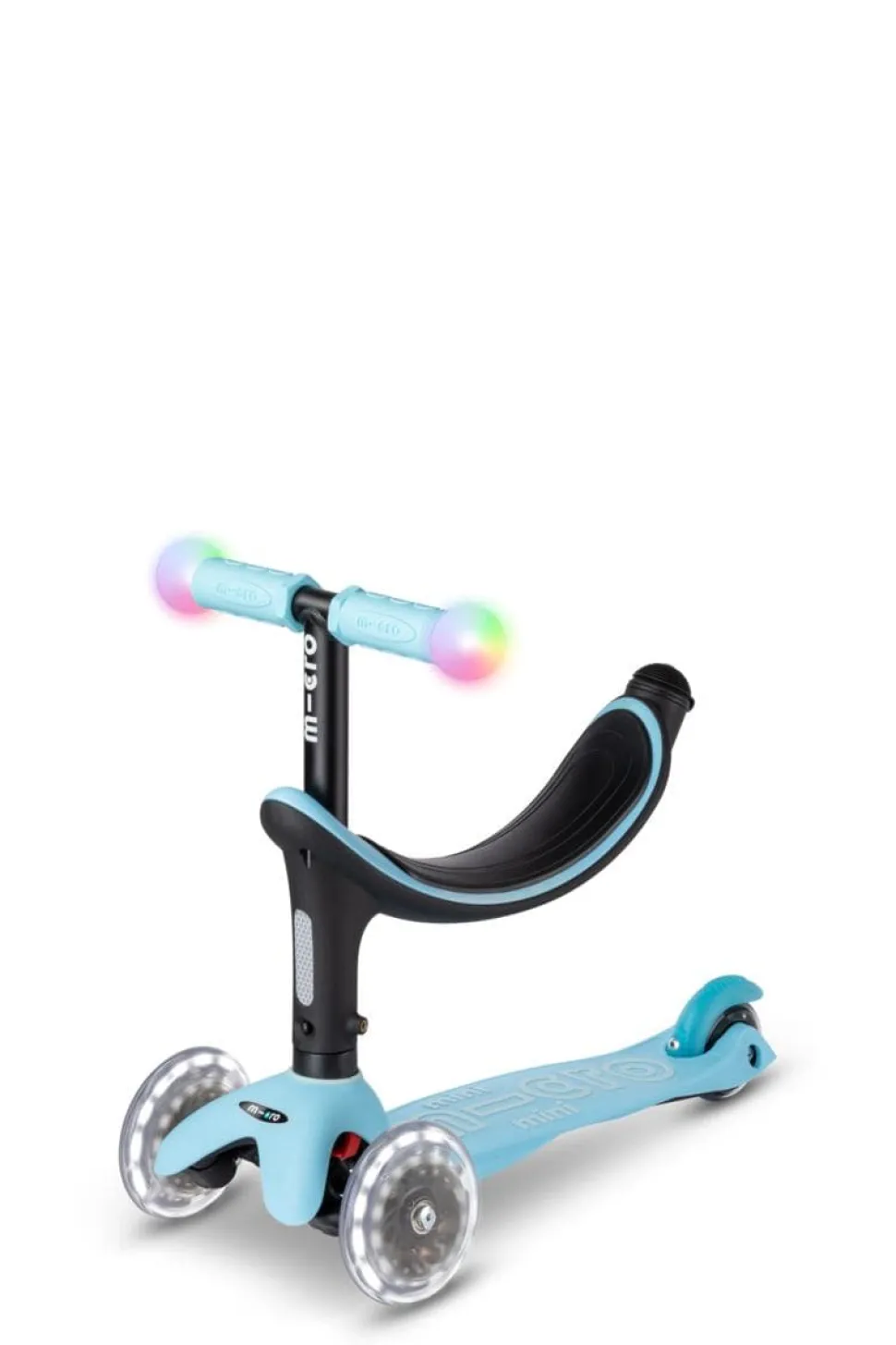 El innovador y ergonómico patinete todo en uno se puede utilizar en diferentes variantes: al principio con asiento, dos opciones de reposapiés y barra de empuje para los padres, posteriormente sin barra de empuje, como una mezcla entre bicicleta de equilibrio y patinete y finalmente como un Mini Micro Deluxe clásico con luces LED mágicas en los extremos del manillar y ruedas lunares LED.