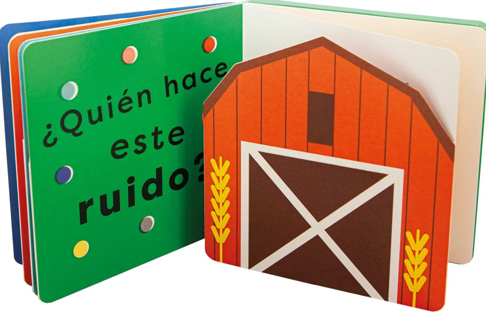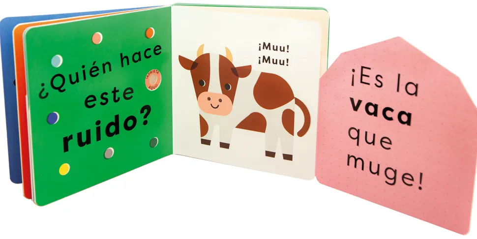 Un libro todo cartón, con solapas y sonidos en todas las páginas, y con un espejo como sorpresa final. Después de escuchar el sonido de
